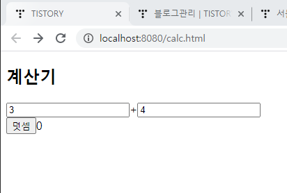 서버를 재실행하고 3,4를 입력후 덧셈버튼을 누르면 404 오류가 발생한다.