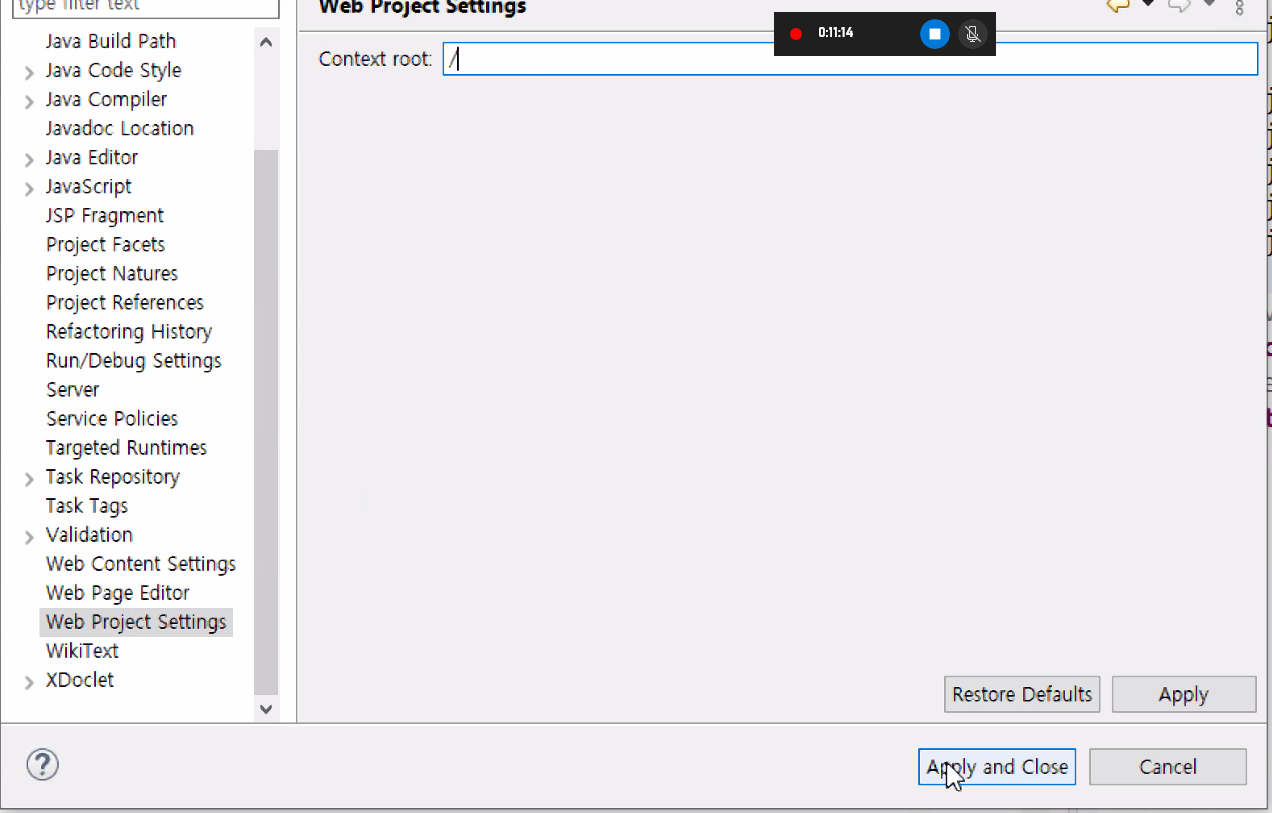 1 . 해당프로젝트 선택 -> 속성 Properities -> web project settings -> JSPPrj지우고 - > /넣어서 루트로 바꿔준다.-> apply and close