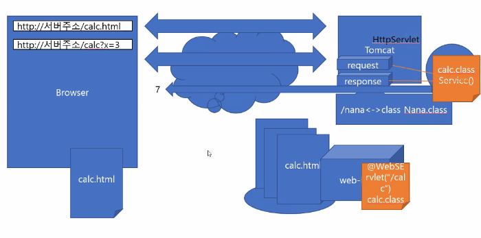 - public class Calc extends HttpServlet{ }을 메모리에 올린다.