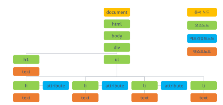 - 모든 요소와 요소의 어트리뷰트,텍스트를 각각의 객체로 만들어 부자관계로 표현하는 트리구조로 구성