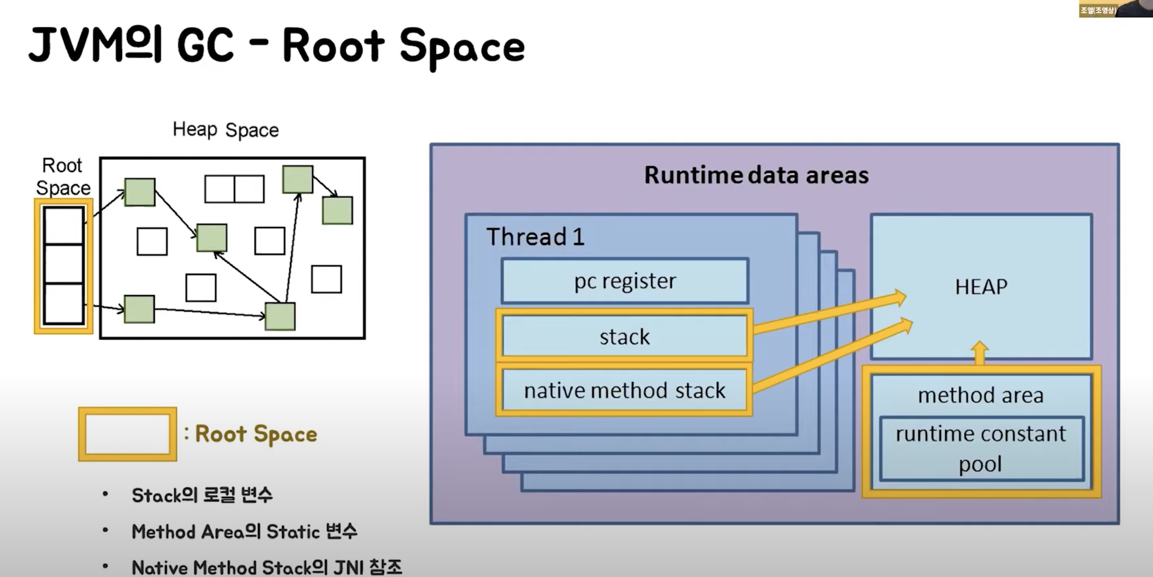 - JVM메모리의 stack의 로컬변수 , method area에 저장된 static변수 , native method stack의 C/C++ 작성되 JNI참조