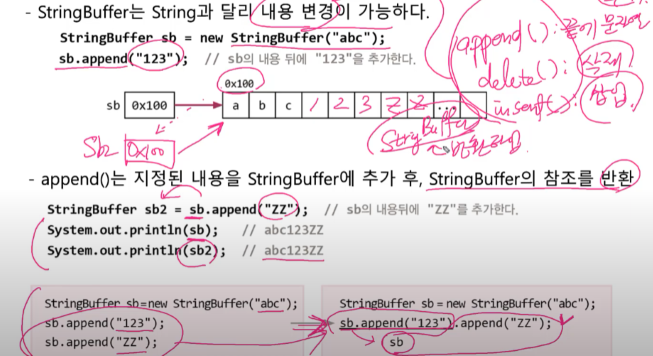 -sb.append(”123”).append(”zz”)가능한 이유가 반환타입이 StringBuffer때문