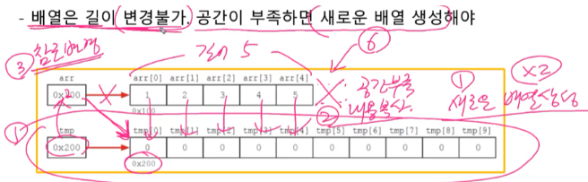 -배열은 길이 변경불가. 공간이 부족하면 새로운 배열 생성해야한다